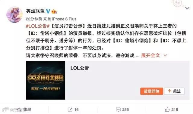 而LOL官方在接到检举后,第一时间对此事做出了正面回应:封号!一年!