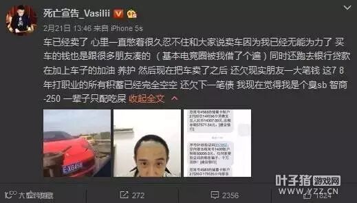 最近,现役《英雄联盟》职业选手死亡宣告在微博中宣布了自己的经济情况,并称自己“法拉利卖了,还欠现实朋友一大笔钱,现在所有的积蓄已空,工资只可以还债。”