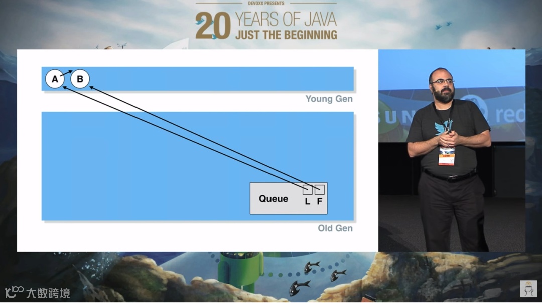 此时就出现了老年代的 Queue 对象,指向了位于年轻代的 A,B 节点,这样的跨代引用。