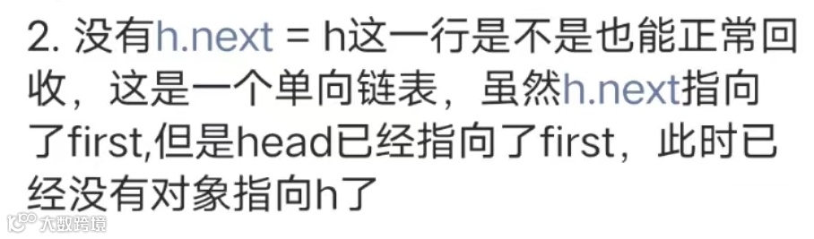 而且,经过前面的分析我们可以知道,理论上,h.next=null 和 h.hext=h 都能达到 help GC 的目的,那么为什么最终的写法是 h.hext=h 呢?