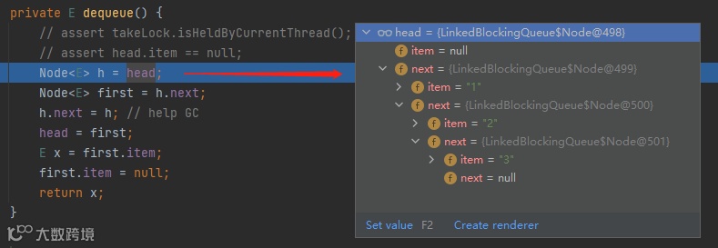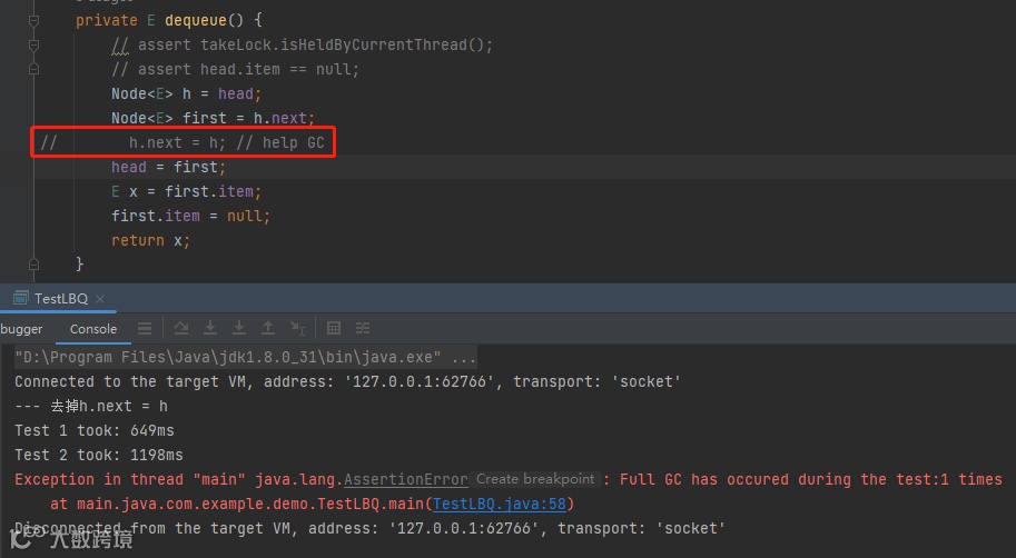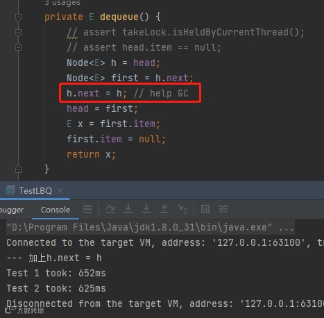 当 LinkedBlockingQueue 里面加入了 h.next=null 的代码,跑上面的程序,输出结果是这样: