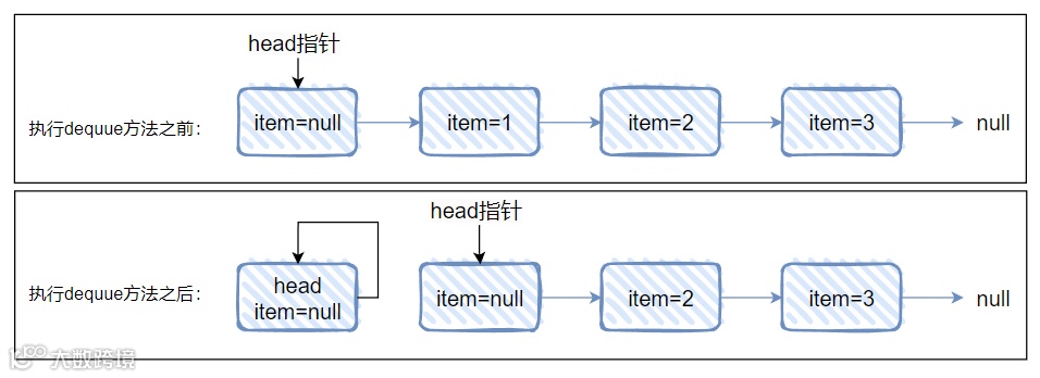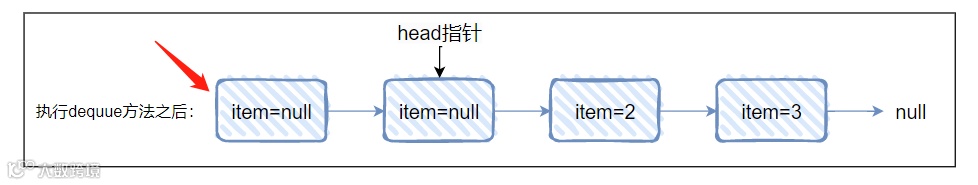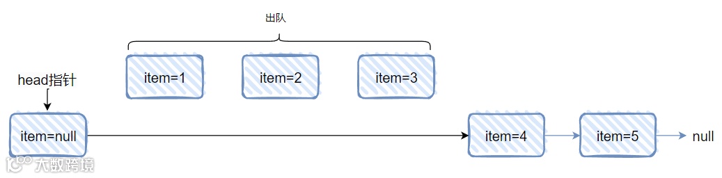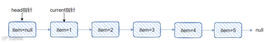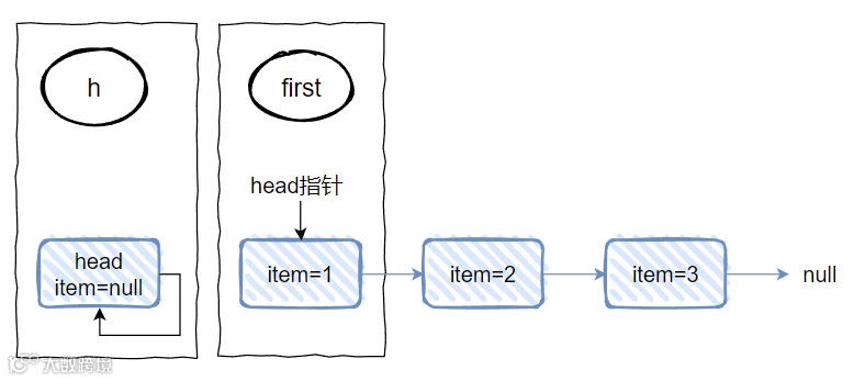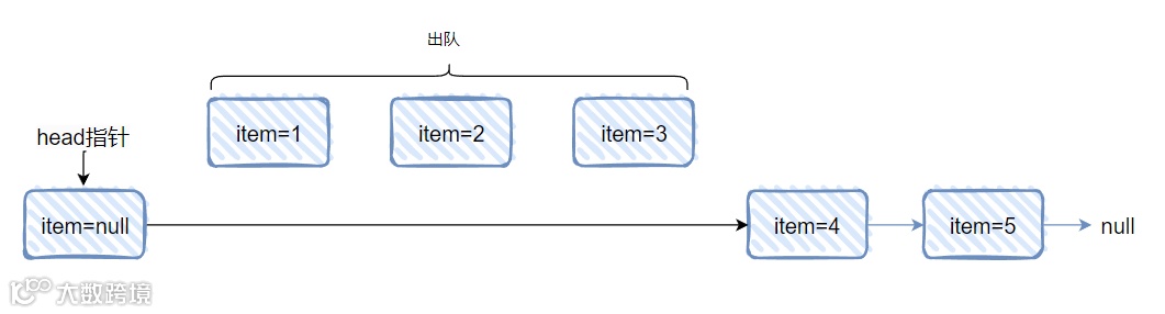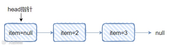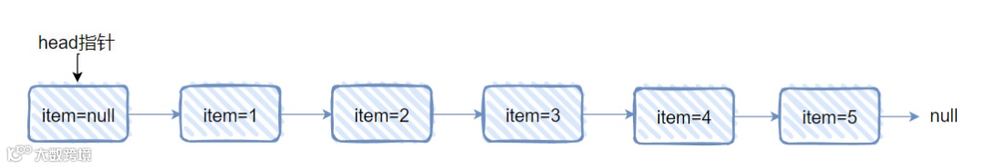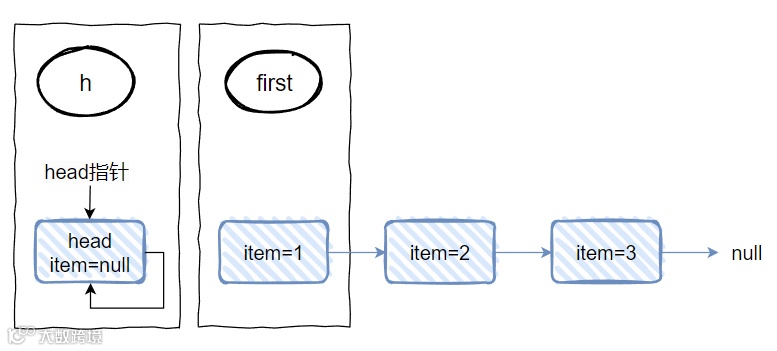 这是一个单向链表,然后 head 结点里面没有元素,即 item=null,对应做个图出来就是这样的: