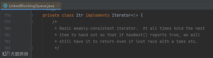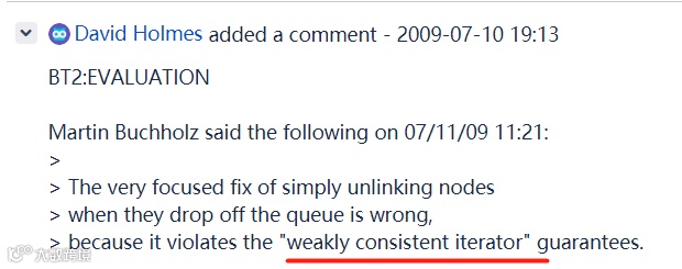如果 hasNext 方法返回为 true,那么就必须要有下一个节点。即使这个节点被比如 take 等等的方法给移除了,也需要返回它。这就是 weakly-consistent iterator。