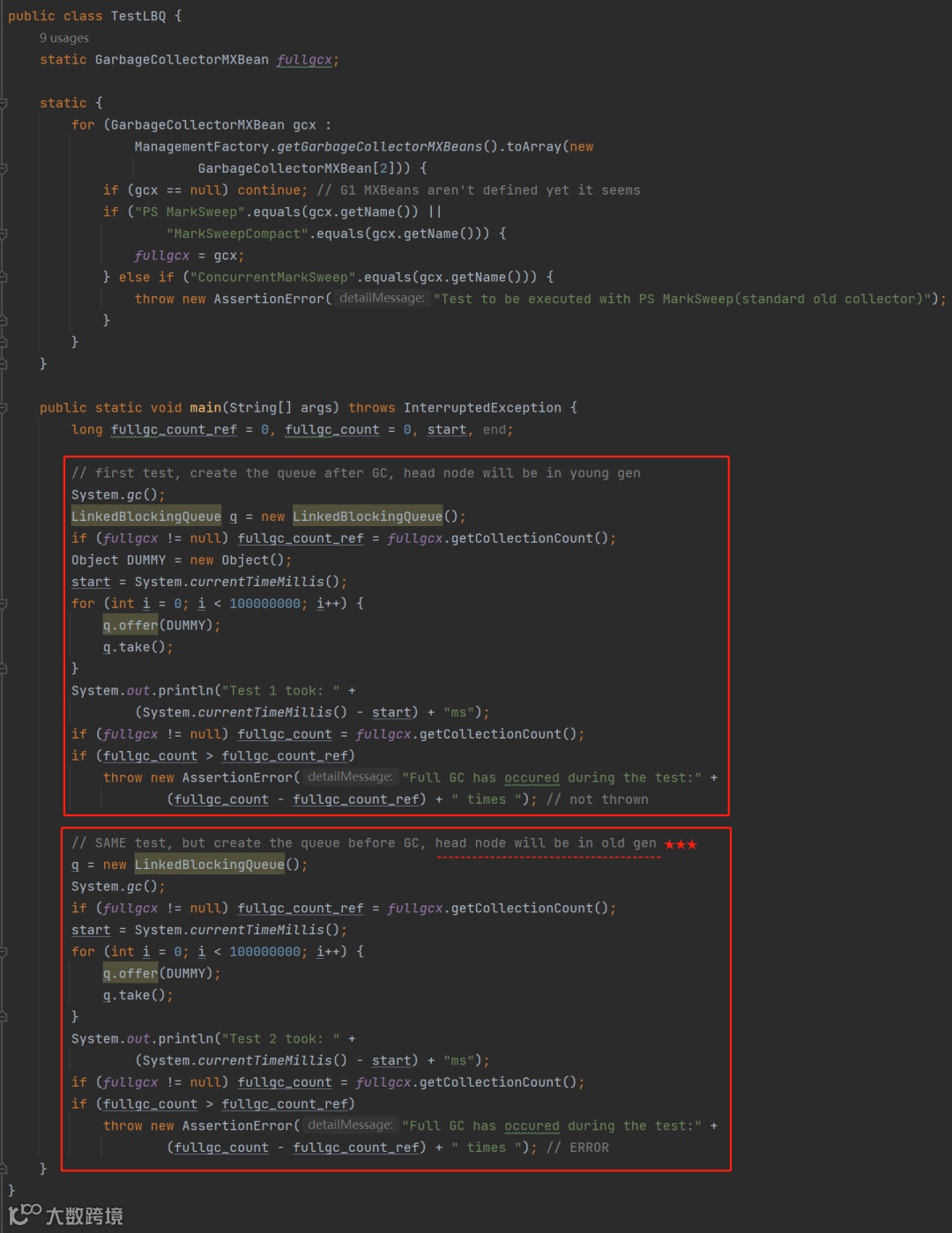SAME test, but create the queue before GC, head node will be in old gen(头节点会进入老年代)