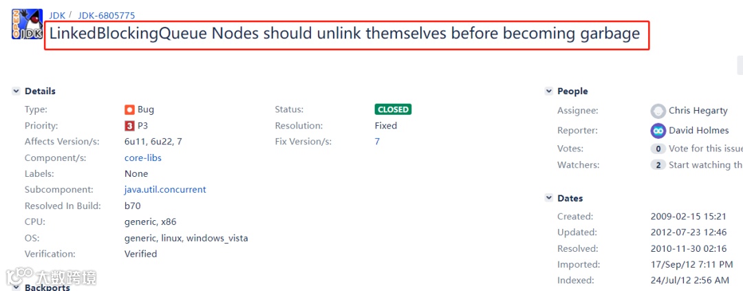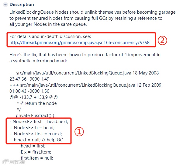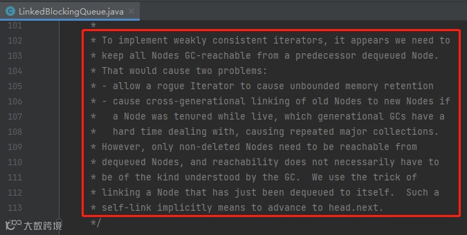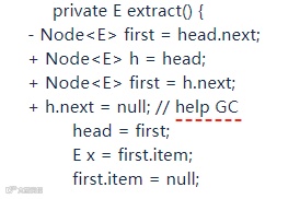 点击进这个链接的原因是标题当时就把吸引到了,翻译过来就是说:LinkedBlockingQueue 的节点应该在成为“垃圾”之前解除自己的链接。