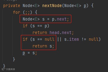 当 1 节点的 next 指为 null 的时候,即 p.next 为 null,那么满足 s==null 的判断,所以 nextNode 方法就会返回 s,也就是返回了 null: