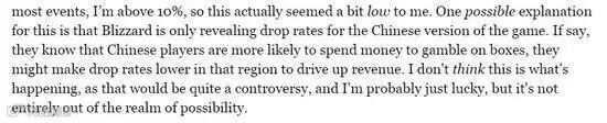 在外媒Polygon的评论文章中写道:或许这以概率适用于中国版本,但不清楚其他服务器的爆率是否也是如此,毕竟在美国没有相关法律要求暴雪这么做。