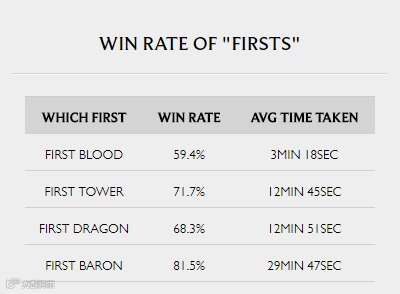除了一血以外,LOL中还存在着许多不同的“一”:一塔,一龙,一男爵等等...下图中显示的就是这些元素对于胜率带来的影响。