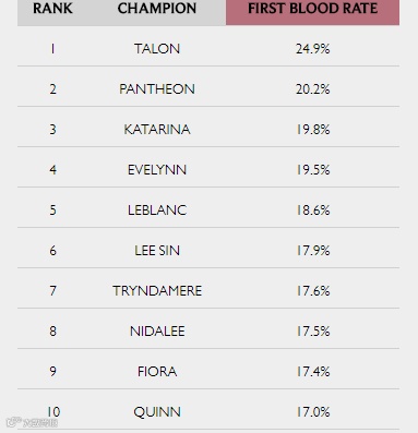 全《英雄联盟》最高及最低一血率:泰隆一血率 24.9% vs 迦娜一血率 1.7%