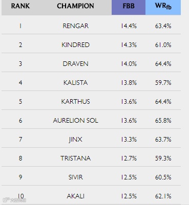 在以下的图表中统计的是“一血获得率”:在有此名英雄出场的游戏中,该英雄取得一血的几率。