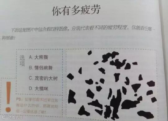 现代年轻人多为亚健康状态,这张图可以测试你的疲劳程度,要是上面都没有你看到的选项,那你可以跟老板请假回家休息了。(别紧张 我胡说的)