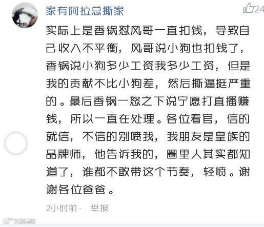 一位自称了解真相的网友称,香锅与RNG的冲突源于队内的管理机制。如果RNG队内选手有违规行为,俱乐部将会按规定扣除部分工资。前些日子RNG队员们纷纷在韩服开启了上分模式,小狗也在直播时表示:俱乐部规定,打不到规定分数线以上是会被扣工资的!