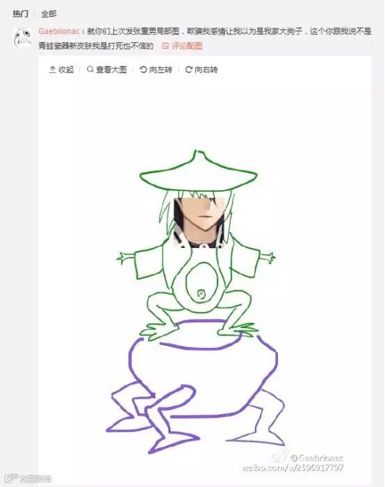 玩家@Gaebrionac:就你们上次发张童男局部图,欺骗我感情让我以为是我家大狗子,这个你跟我说不是青蛙瓷器新皮肤我是打死也不信的!哈哈哈哈,看完这张神画作,小编发出了惊天地泣鬼神的笑声。……但是,兄弟,你告诉我一下你是怎么把之前的图透当成大天狗的行吗,万万没想到啊!