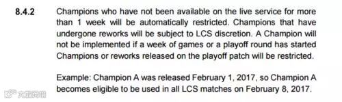 根据Riot官方规则书8.4.2的描述,一名新英雄/重做英雄如果恰好于季后赛版本推出,他将会被自动禁用。LCS季后赛将于7.6版本环境下进行,而LPL目前仍剩余3周的常规赛赛程,尚不确定这位新英雄能够在中国赛区的季后赛中登场。