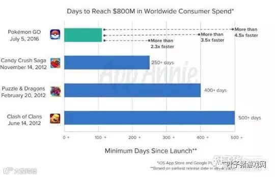 App Annie此前曾经发布报告表示,《精灵宝可梦Go》斩获6亿美元收入的速度超过了其他任何一款游戏。《精灵宝可梦Go》在不到90天的时间内就实现了这一里程碑,而相较之下,其他热门游戏收入达到6亿美元所花的时间就显得长了许多:《糖果粉碎传奇》花了超过200天的时间,《智龙迷城》花了超过400天的时间,而《部落冲突》则花了超过500天的时间