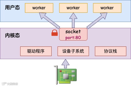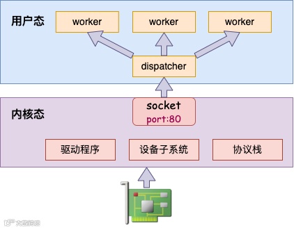 这种多进程模型有两个问题,首先第一个是 dispatcher 进程并不处理任务,需要转交给 worker 进程来处理和响应。这会导致一次额外的进程上下文切换的开销。第二个问题是如果流量特别大的时候 dispatcher 进程很容易成为制约整个服务 qps 提升的瓶颈。