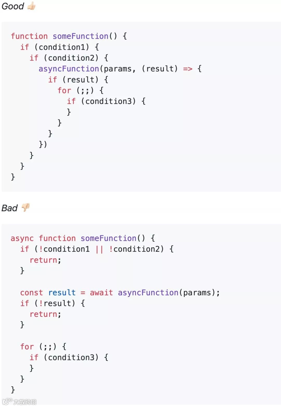 我们需要避免采用缩进,因为缩进会使复杂代码在编辑器中占用更多的空间。如果一定要采用缩进,那么就使用混合缩进策略。当然,这种策略在 Python 中是行不通的,因为它靠缩进来确定代码结构。