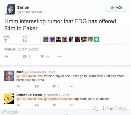 LCS的Echo Fox战队主教练simon推特:听到了一个有趣的传闻,EDG给Faker开出了400美元的价格。