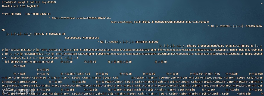 直接去查看第4个binlog文件,看到的全都是乱码,就像下面这样,这是因为binlog文件是二进制的