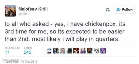 截至目前,拳头官方没有对此事作出评论,而Likkrit的病情也不足以让官方将总决赛赛程推迟,所以四分之一决赛仍将在周四(美国时间)于芝加哥如期进行。虽然小编也想祝他们早日康复,不过转念一想在他们生病的两个多月里,每场比赛他们的发挥都十分出色。相信对于俄罗斯的大兄弟来说这点病算不了什么,毕竟没有什么困难能够打倒战斗民族!