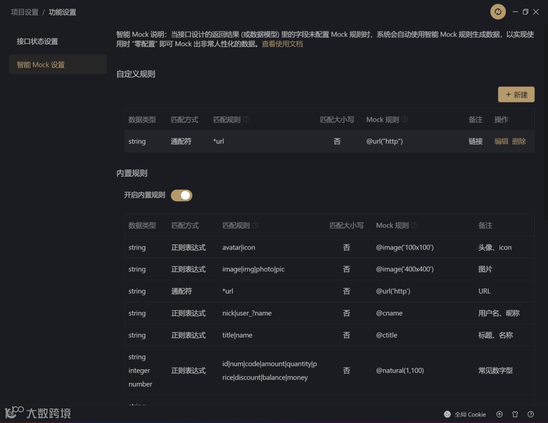 用户还可以自定义规则库,满足各种个性化需求。支持使用 正则表达式、通配符 来匹配字段名自定义 mock 规则。