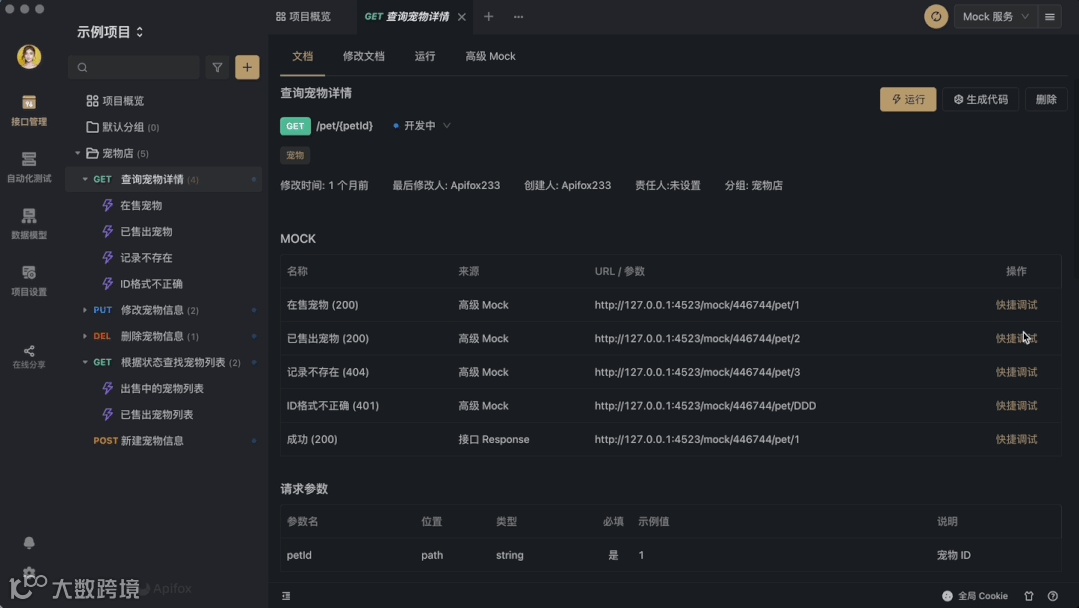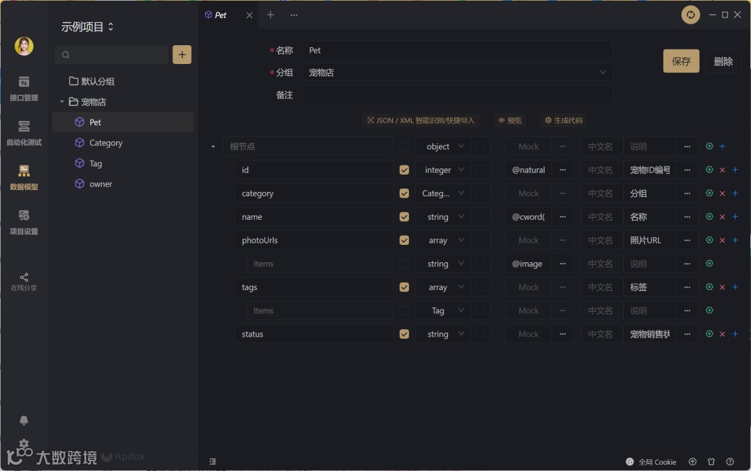 Apifox 根据接口定义里的数据结构、数据类型,自动生成 mock 规则。Apifox 内置智能 mock 规则库,根据字段名、字段数据类型,智能优化自动生成的 mock 规则。