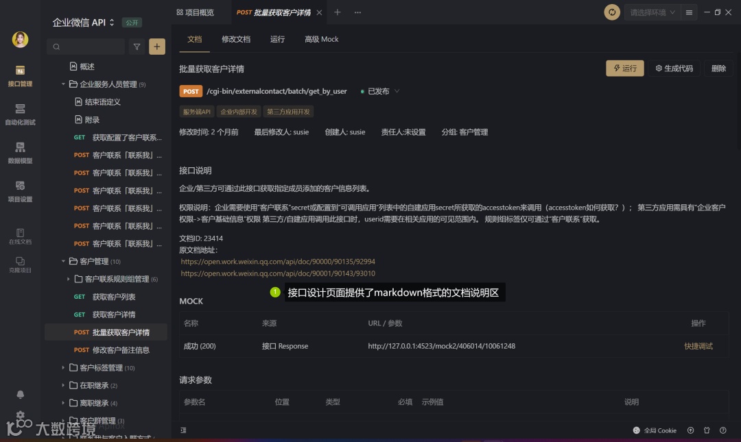 内置企业微信开放 API ,抖音开放 API 等第三方接口开放项目,接口可以直接在 Apifox 中调试,不需要到处找接口文档和手工填写接口。