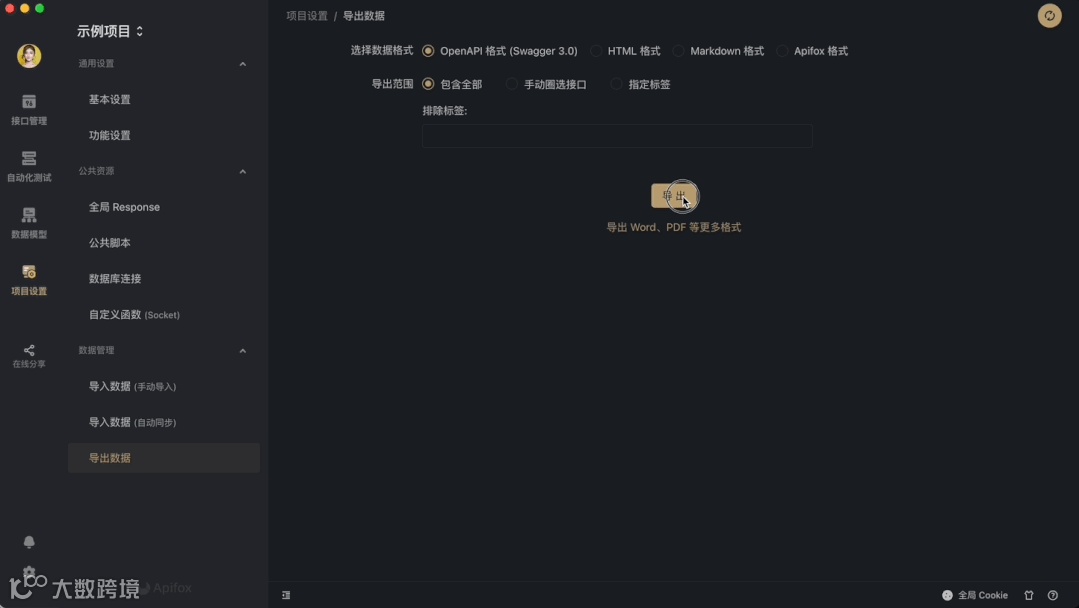 项目也支持以 html 或者 OpenApi ,Markdown 格式导出,可用于数据备份或合作人员查看。