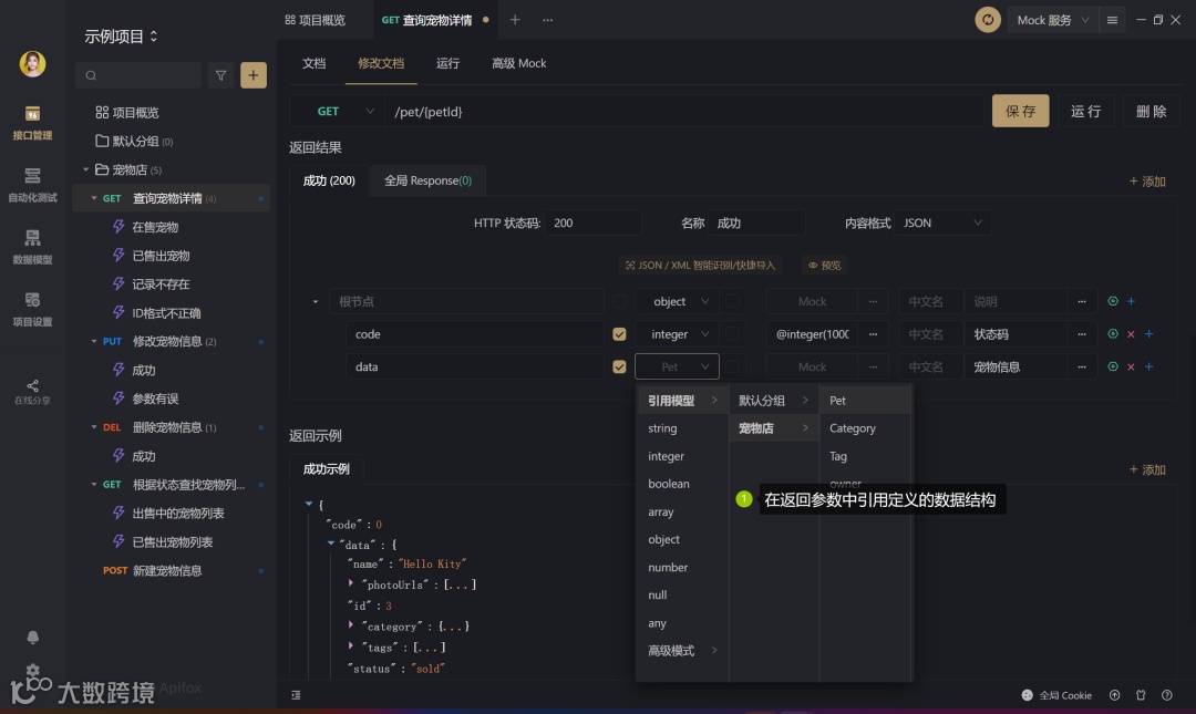 数据模型复用:可复用的数据结构,定义接口返回数据结构及请求参数数据结构(仅 JSON 和 XML 模式)时可直接引用。