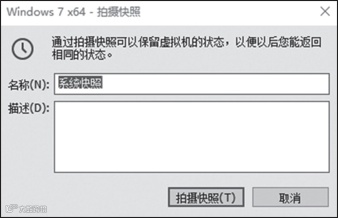 配置好虚拟机后请不要急于调试和分析病毒样本,我们需要先做快照备份,用于虚拟调试环境的还原工作。依次单击菜单选项“虚拟机”→“快照”→“从当前状态创建快照”,弹出快照创建窗口,如图 16-2 所示。