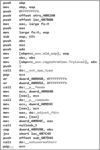 图 16-3 所示为入口处的部分反汇编代码,是 VS 编译器生成的代码,它们并不是我们关心的病毒程序的功能代码,故不对其进行分析。我们直接从 WinMain 处理代码开始分析,如图 16-4所示。