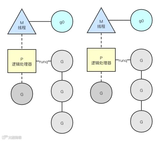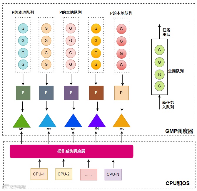 P是一个抽象的概念,不是物理上的CPU而是表示逻辑处理器。当一个P有任务,需要创建或者唤醒一个系统线程M去处理它队列中的任务。