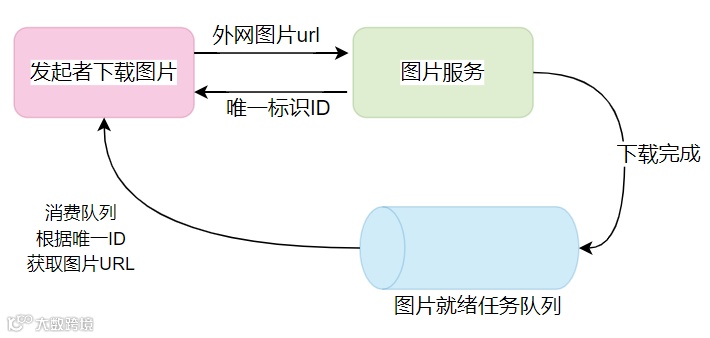 还是以为异步图片下载为例,图片服务中台提供了异步接口,发起者请求之后立即返回,图片服务此时给了发起者一个唯一标识ID,等图片服务完成下载后把结果放到一个消息队列,此时需要发起者不断消费这个MQ才能拿到下载结果。