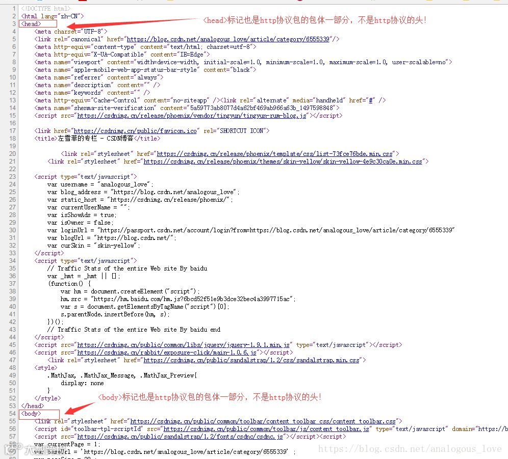 http 协议分为 head 和 body 两部分,但是我们一般说的 html 文档中的 和 部分是 html 文档的 head 和 body,它们都是 http 协议的 body 部分。示意图如下: