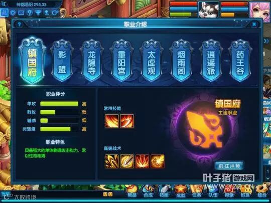 职业设定则是定位清晰、特色鲜明。共有镇国府、影盟、龙隐寺、重阳宫、太虚观、烟雨阁、逍遥派、药王谷八大门派。