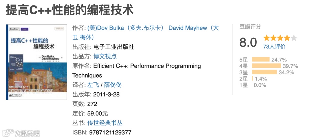 当你学习好了 C++ 语言本身,你可以学习一下 C++ 的一些常见惯用法和高性能编码实践,这里我推荐一本经典书籍叫《提高C++性能的编程技术》,这本书详细讨论了临时对象、内存管理、继承、虚函数、内联、引用计数以及 stl 等一切有可能提升 C++ 效率的细节内容。最终,该书将c++性能提升的各种终极利器,完美地呈现在读者的面前!最关键的是,这本书非常薄,但是书中介绍的每个专题都是实战中常用的技术,强烈推荐。