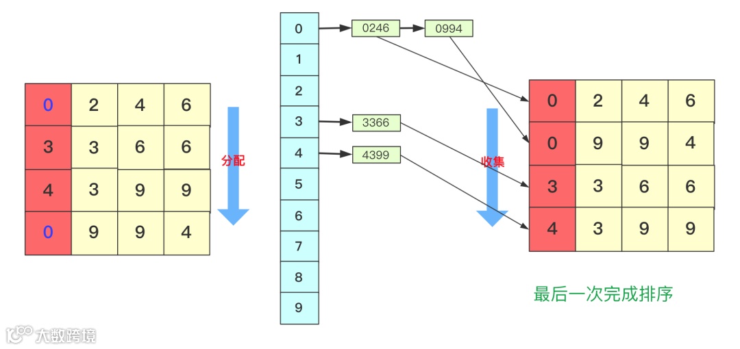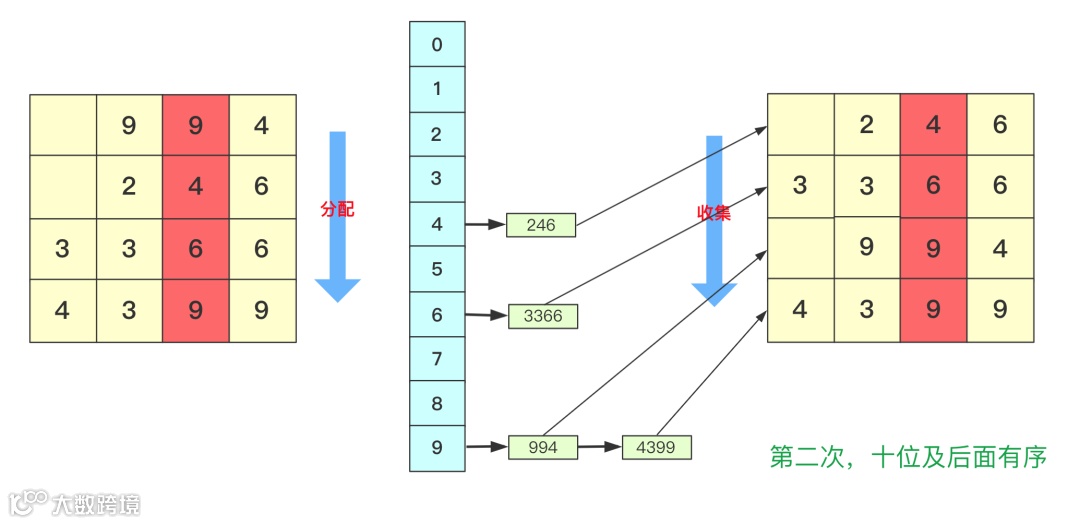 分配和收集都是有序的,第二次会根据十位进行分配、收集,此次是在第一次个位分配、收集基础上进行的,所以所有数字单看个位十位是有序的。
