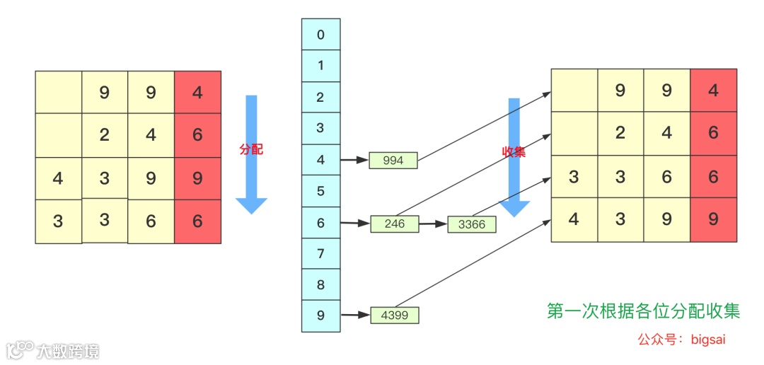 所以遇到这种情况我们基数排序思想很简单,就拿 934,241,3366,4399这几个数字进行基数排序的一趟过程来看,第一次会根据各位进行分配、收集: