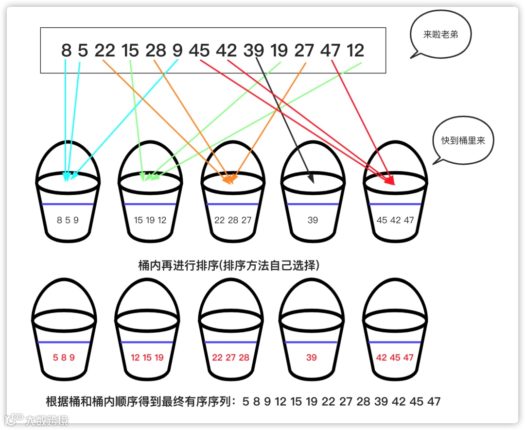桶:若干个桶,说明此类排序将数据放入若干个桶中。 -