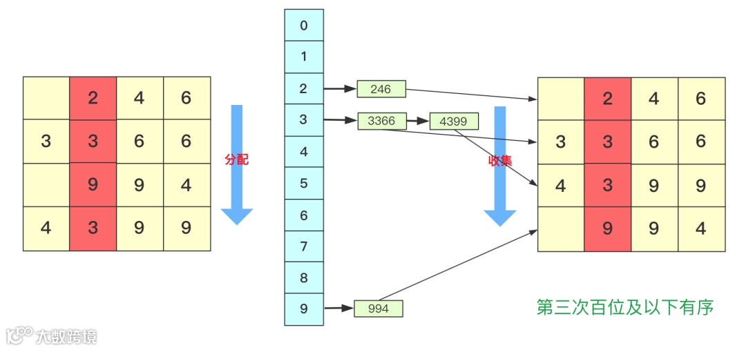 而第三次就是对百位进行分配收集,此次完成之后百位及其以下是有序的。