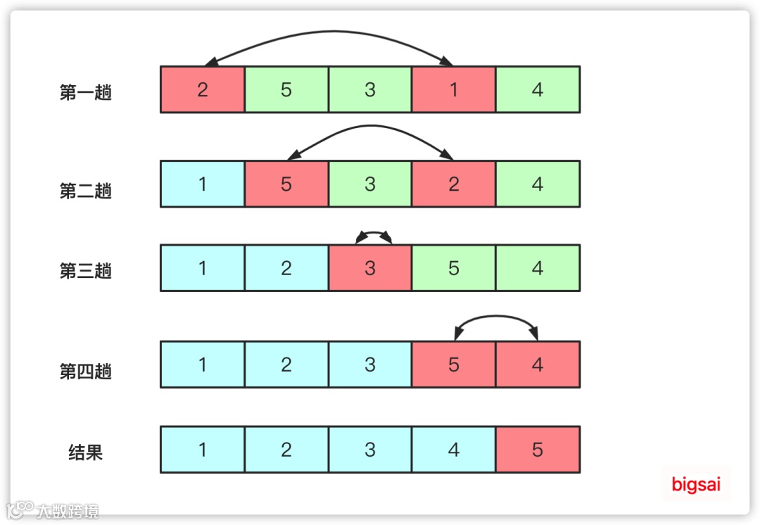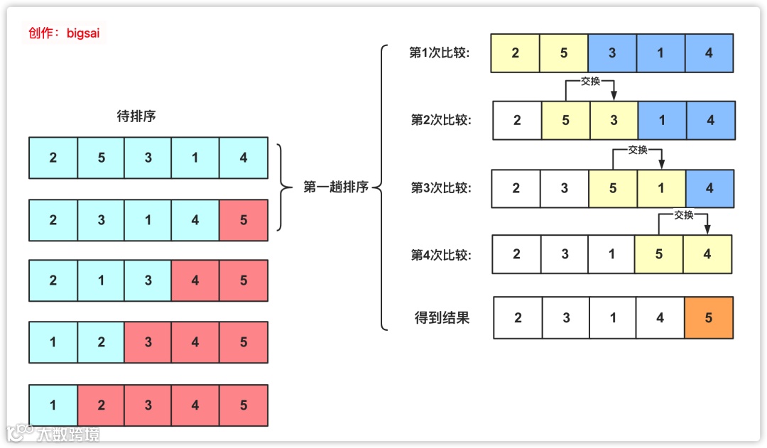 从第一个元素开始往后遍历,每到一个位置判断是否比后面的元素大,如果比后面元素大,那么就交换两者大小,然后继续向后,这样的话进行一轮之后就可以保证「最大的那个数被交换交换到最末的位置可以确定」。 -
