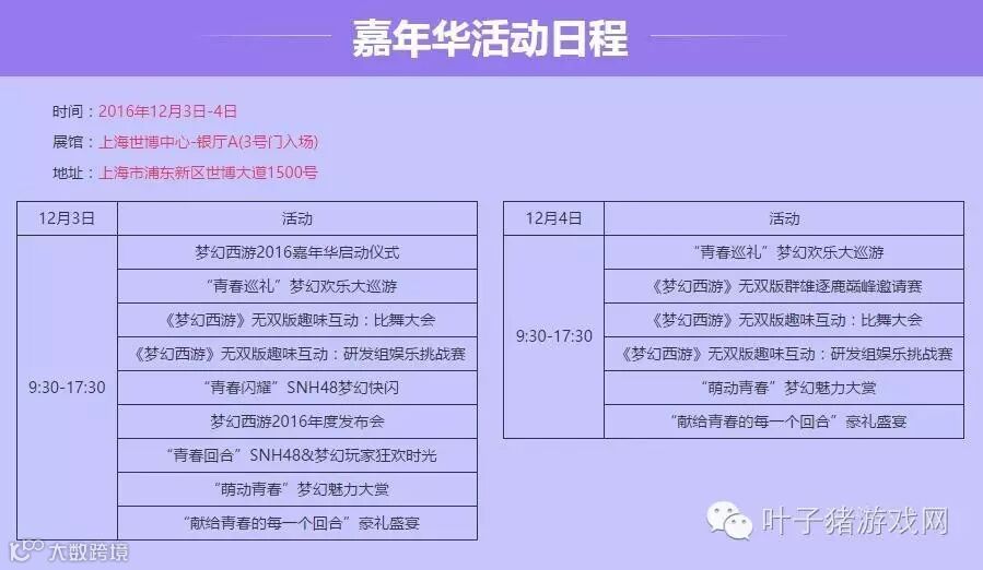 2016梦幻西游嘉年华地址:上海世博中心-银厅(A),上海浦东新区世博大道1500号(3号门)