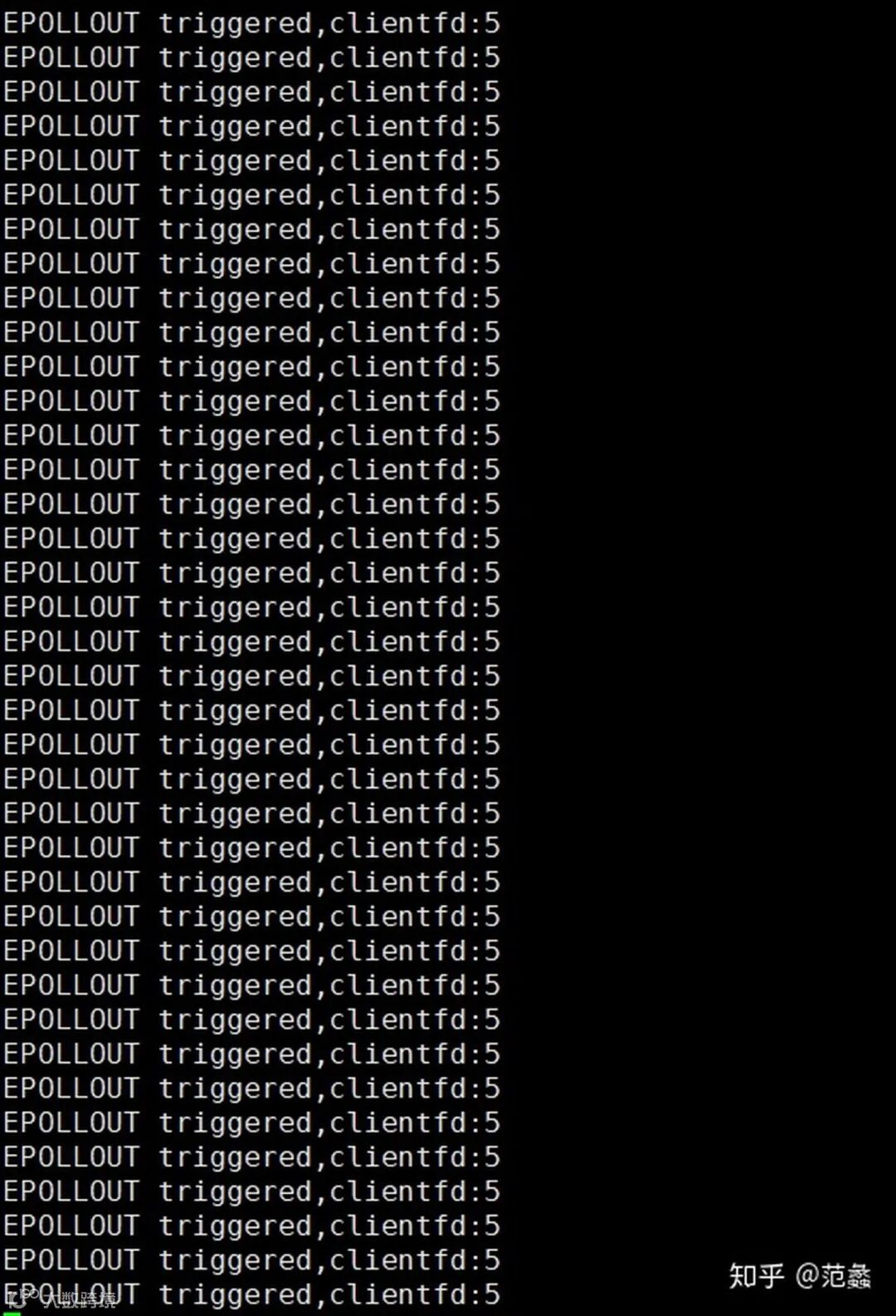 之所以是这样,是因为我们注册了可写事件且使用的是 LT 模式,LT 模式下,由于这里的服务器端对应的客户端 fd 一直是可写的,有写事件一直触发,所以看到屏幕不断输出。