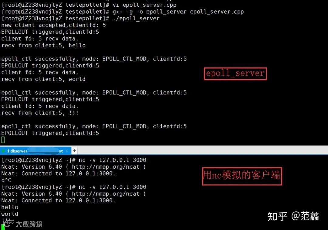 然后使用 nc 命令模拟一个客户端去连接 epoll_server:
