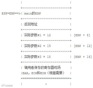 在我们的例子中,调用者是main,它准备调用函数foo。在函数调用前,main正在用ESP和EBP寄存器指示它自己的栈帧。
