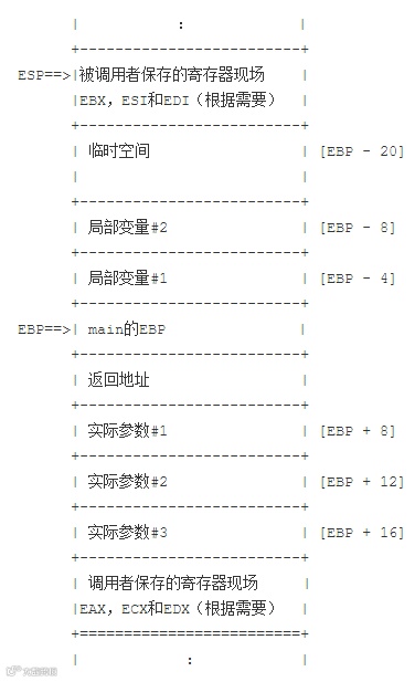 函数foo的执行也许还会调用别的函数,甚至递归地调用foo本身。然而,只要EBP寄存器在这些子调用返回时被恢复,就可以继续用EBP加上偏移量的方式访问实际参数,局部变量和临时存储。