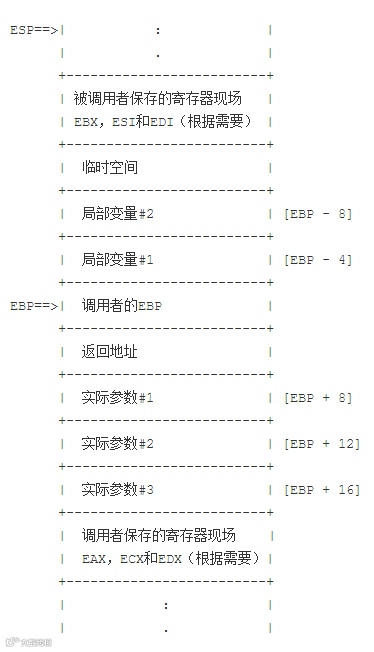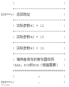 由于被调用者允许使用EAX,ECX和EDX寄存器,所以如果调用者希望保存这些寄存器的值,就必须在调用子函数之前显式地把他们保存在栈中。另一方面,如果除了上面提到的几个寄存器,被调用者还想使用别的寄存器,比如EBX,ESI和EDI,那么,被调用者就必须在栈中保存这些被额外使用的寄存器,并在调用返回前回复他们。也就是说,如果被调用者只使用约定的EAX,ECX和EDX寄存器,他们由调用者负责保存并回复,但如果被调用这还额外使用了别的寄存器,则必须有他们自己保存并回复这些寄存器的值。