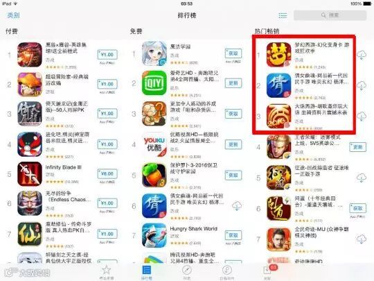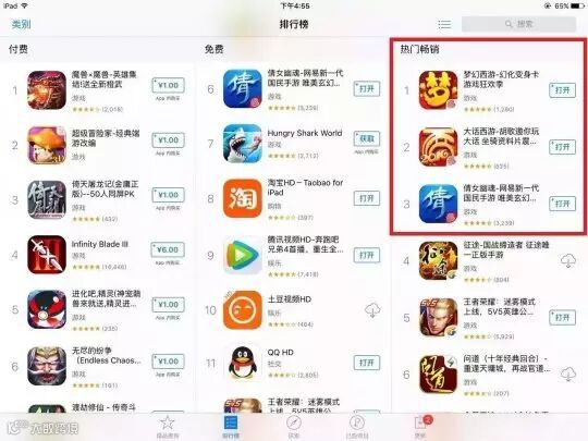 不过星期天的iPad热销榜好像有些不同,排在第二的《大话西游》手游版掉到了第三,而刚刚登陆App Store不久的《倩女幽魂》手游版竟跑到了第二。
