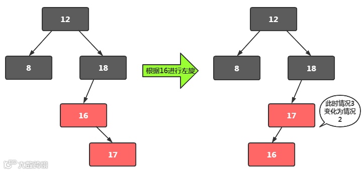 待插入元素比红父大,且红父自身就是左倾。待插入数据比红父左节点大,形成了右倾。通过左旋变成情况2处理。