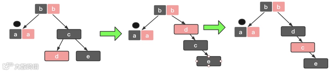 红 - 黑或者黑 - 黑关注节点从 a 变成其父节点 b,继续从四种情况中选择符合的规则来调整。